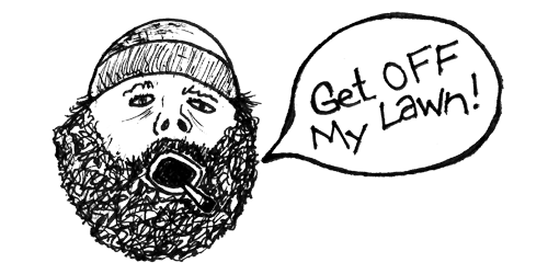 The logo he did for "Get Off My Lawn Records" is recognizable as the face of an old hobo from a picture on a greeting card I've seen 1,000 times at stores like Spencer Gifts. In the picture, the hobo is giving the middle finger, and the card usually says something like "happy birthday, go fuck yourself."